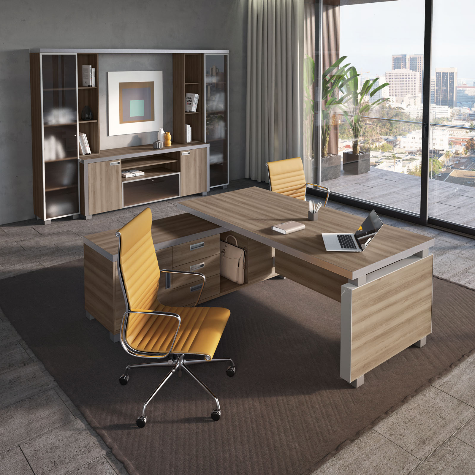 Легкость и эффектность конструкции элементов обеспечена интересным дизайном и выбранным цветовым исполнением. Светлый и темный Дуб прекрасно смотрится в офисе, оформленном как в классическом, так и современном дизайне. Выбор этого оттенка подчеркивает шпонированная поверхности, что делает коллекцию естественной. Современные дизайнеры любят такое предложение. Ведь элементы мебели, изготовленные в одной структуре, но в разных цветовых разрешениях комбинируются. Интерьер станет стильным и динамичным.